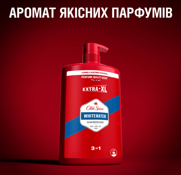 Насолоджуйтеся незабутньою довготривалою свіжістю та фантастичною впевненістю з гелем для душу та шампунем Old Spice Whitewater для чоловіків. Завдяки глибокій формулі очищення та ароматам якісних парфумів цей засіб усуває бруд і неприємний запах, залишаючи вам відчуття свіжості та чистоти. Універсальна формула 3 в 1 працює на волоссі, обличчі та тілі, залишаючи вашій шкірі відчуття незабутньої м'якості, тож ви можете зосередитися на більш важливих заняттях, як-от укласти угоду або навчити дельфінів говорити. Спробуйте аромат якісних парфумів Whitewater і вирушайте в подорож ароматами. Цей підбадьорливий аромат свіжої води, сандалового дерева, з цитрусами та нотками бурштину надасть вам неперевершеного аромату, як пісні сирен.