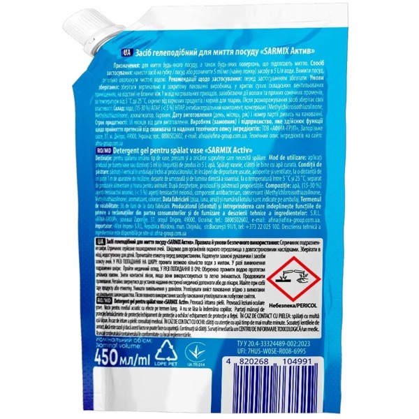- Гель для миття посуду Sarmix Актив дой-пак 450 мл