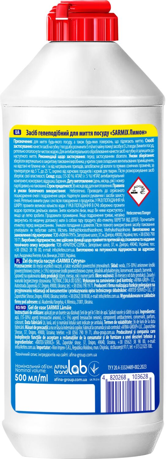 Гель Sarmix лимон розроблений для миття посуду, а також будь-яких поверхонь, що підлягають миттю. Покращена формула забезпечує ще більш ефективне видаленння жиру та складних забруднень. Має приємний цитрусовий аромат.