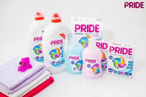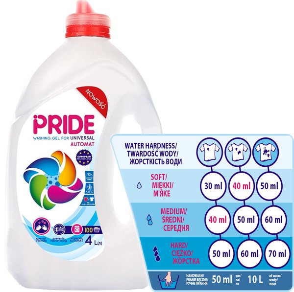 Гель для прання універсальний PRIDE - новий революційний продукт, який створено у співпраці з європейськими технологами. Гелі для прання набирають все більшу популярність серед українських споживачів і гель PRIDE повністю відповідає європейським і українським стандартам. Покращена формула гелю гарантує високу якість прання для білої і кольорової білизни, при цьому гель діє більш делікатно і ефективно працює вже при температурі 30 °С. Гель PRIDE не містить агресивних барвників і не забарвлює білі речі після прання.
