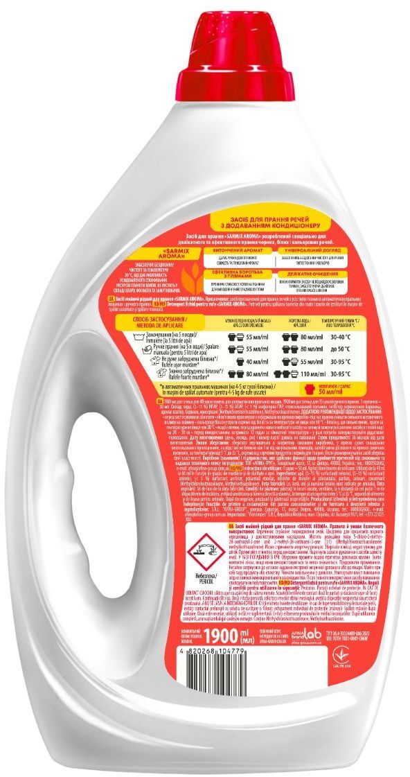 Засіб для прання «Sarmix Aroma» розроблений спеціально для делікатного та ефективного прання чорних, білих і кольорових речей. Підходить для прання речей з усіх типів тканин в автоматичних пральних машинах і ручного прання. Гель забезпечує бездоганну чистоту вже за температури 20 °C, що дає можливість усвідомленого споживання ресурсів планети Земля.
