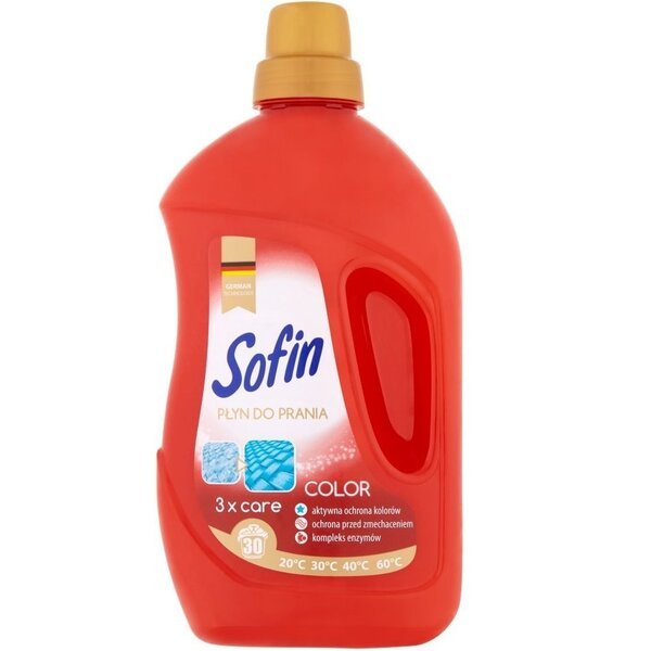Sofin Color 3 x care це спеціальний засіб для прання кольорових і делікатних тканин. Ефективно відпирає та одночасно захищає кольорові тканини під час прання. Делікатні мийні компоненти активної формули захисту кольору роблять Sofin Color ефективним захистом від: вицвітання, втрати кольору, пошкодження тканини. Містить компоненти, що розгладжують волокна бавовни та бавовняних тканин. За регулярного використання зменшує утворення катишків завдяки функції захисту від зминання. Надає тканинам аромат і робить їх приємними на дотик. Завдяки комплексу ензимів засіб ефективно відпирає тканини та працює за температури до 20°C.
