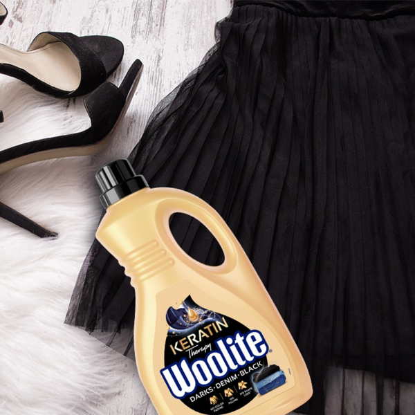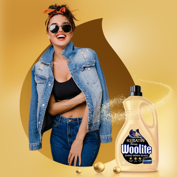 Гель для прання Woolite для чорних і джинсових тканин з кератином - спеціальний засіб, розроблений для дбайливого догляду за чорними, темними і джинсовими тканинами. Завдяки вмісту кератину, гель зміцнює волокна тканин, запобігає вицвітанню і зберігає насиченість кольору після кожного прання.