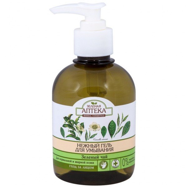 Забезпечує делікатне щоденне очищення шкіри обличчя і шиї без пересушування і відчуття стягнутості. Безмильная основа гелю чи не порушує природний захисний бар'єр , що не пересушує шкірну мантію, освіжаючи і підтримуючи в нормі природний pH-баланс. Дерматологічно тестований. Не містить парабенів і барвників. Екстракт листя зеленого чаю легко усуває зайву жирність, нейтралізує токсини, захищаючи від вільних радикалів і попереджаючи передчасне старіння. Протеїни пшениці допомагають відновити природні захисні функції шкірних покривів. Д-пантенол в сприянні з алантоїном мають виражену пом'якшуючу і регенеруючу дію, даруючи шкірі м'якість і ніжність. Гель для вмивання від ТМ «Зелена аптека» універсальний, ретельно і дбайливо доглядає за нормальною і жирною шкірою. Пройшов дерматологічний контроль, не містить барвників і парабенів. Спосіб застосування: Нанести на вологу шкіру, змити водою. Склад: Aqua, Lauryl Glucoside, Sodium Laureth Sulfate, Cocamidopropyl Betaine, PEG-7 Glyceryl Cocoate, Glycerin, Hydrolyzed Wheat Protein, Green Tea Leaf Extract, Allantoin, Panthenol, Parfum, Sodium Chloride, Disodium EDTA, Benzyl Alcohol, Methylchloroisothiazolinone, Methylisothiazolinone, Citric Acid.