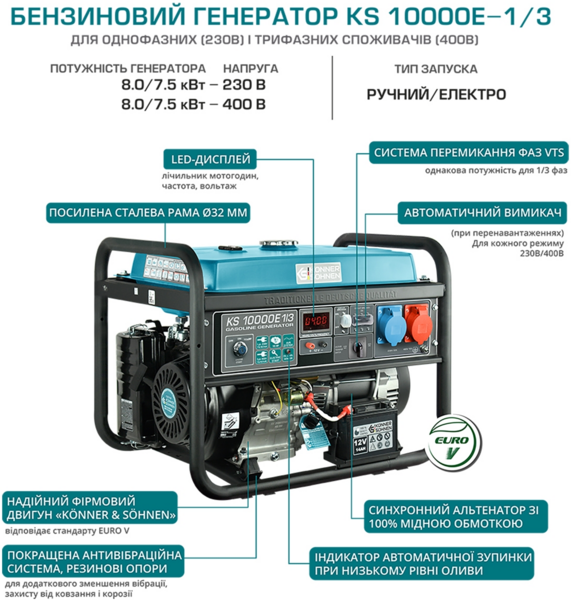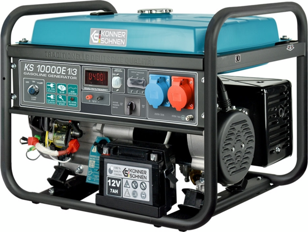 Двигуни відповідають усім світовим та європейським стандартам якості, економічності, екологічності, в тому числі сучасному екологічному стандарту Euro V. Кожний двигун та кожний генератор мають свої індивідуальні серійні номери, що дозволяє контролювати якість виробництва та сервісного обслуговування. Двигуни Könner & Söhnen вирізняються легким стартом та пониженою вібрацією. Лінійка бензинових генераторів KS 10000 оснащена надійним 1-циліндровим двигуном.