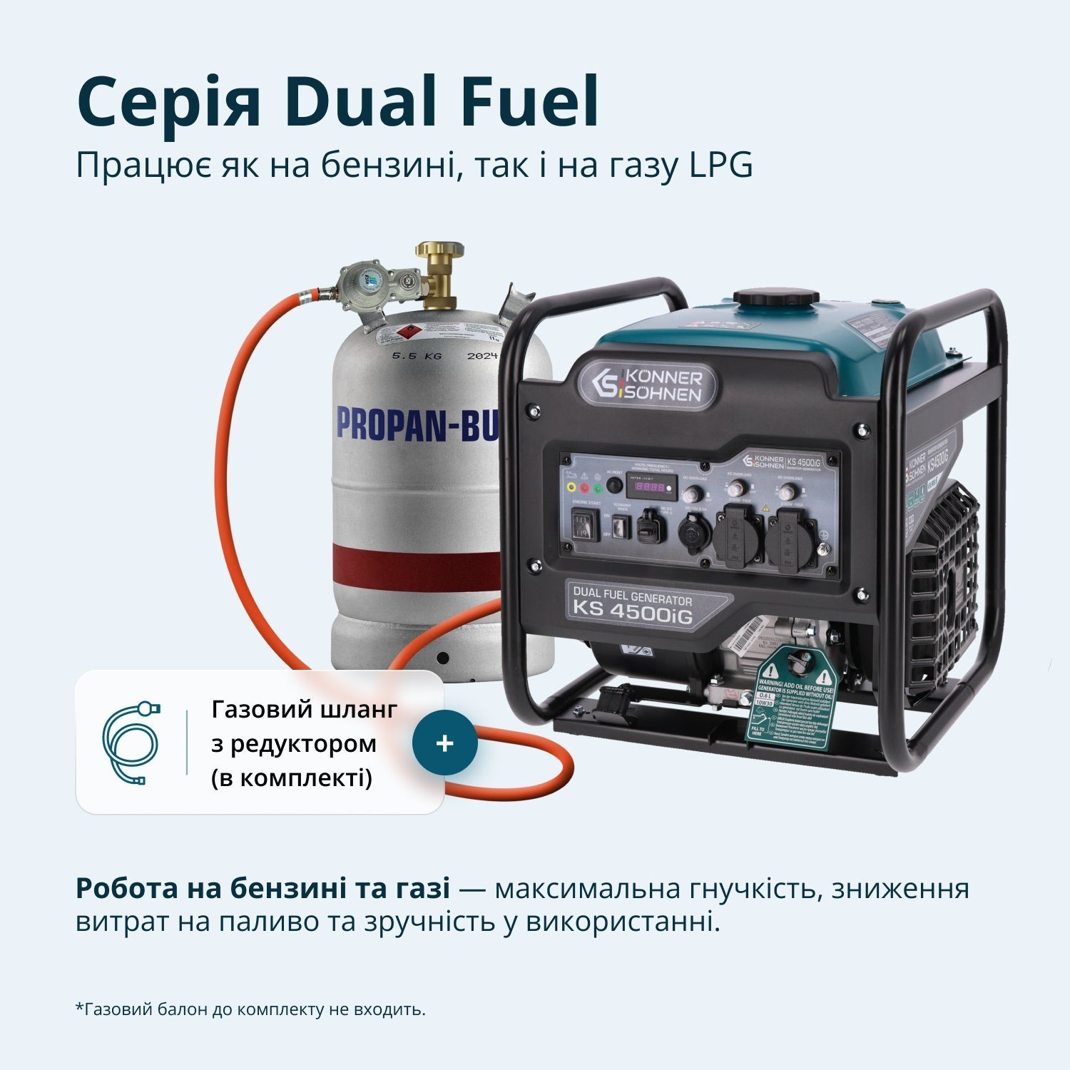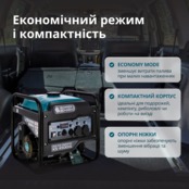 Працює на бензині (4,2 кВт) та зрідженому газі (3,8 кВт), зменшуючи витрати та шкідливі викиди.