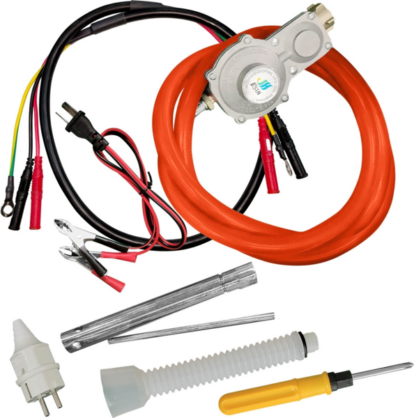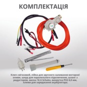 Генератор укомплектований додатковими аксесуарами: ключ свічковий, лійка для зручного заливання моторної оливи, шнур для паралельного підключення, шланг з редуктором, вилка 16 А Schuko, викрутка РН2 6,0 мм, клеми для заряджання акумулятора.