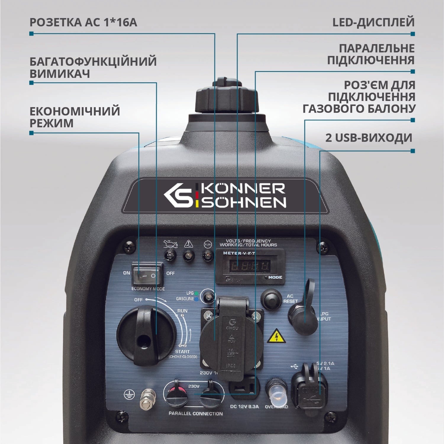 Зручне розташування усіх функцій: LED-дисплей (лічильник мотогодин, вольтаж, частота), індикатори контролю стану генераторної установки, що сигналізують про робочий стан, спрацювання автомата захисту при перевантаженні або короткому замиканні, про низький рівень оливи, кнопка Reset для перезавантаження системи контролю та відновлення подачі напруги, роз’єм для паралельного підключення генераторів, два USB-виходи (5B/1A, 5B/2.1A), розетка 230В та клема заземлення.