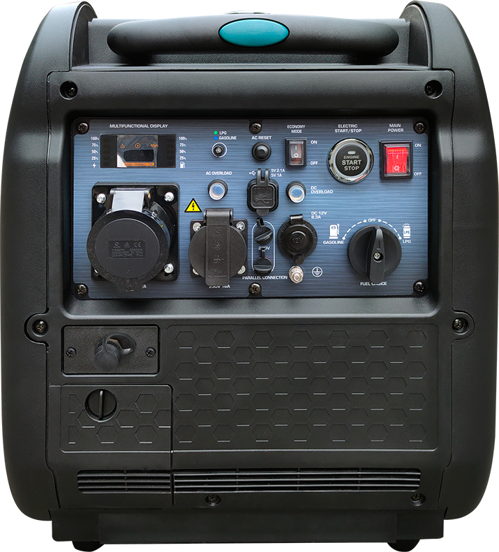 Зручне розташування усіх функцій: LED-дисплей (лічильник мотогодин, вольтаж, частота), індикатори контролю стану генераторної установки, що сигналізують про робочий стан, спрацювання автомата захисту при перевантаженні або короткому замиканні, про низький рівень оливи, кнопка Reset для перезавантаження системи контролю та відновлення подачі напруги, роз’єм для паралельного підключення генераторів, два USB-виходи (5B/1A, 5B/2.1A), розетка 230В та клема заземлення.