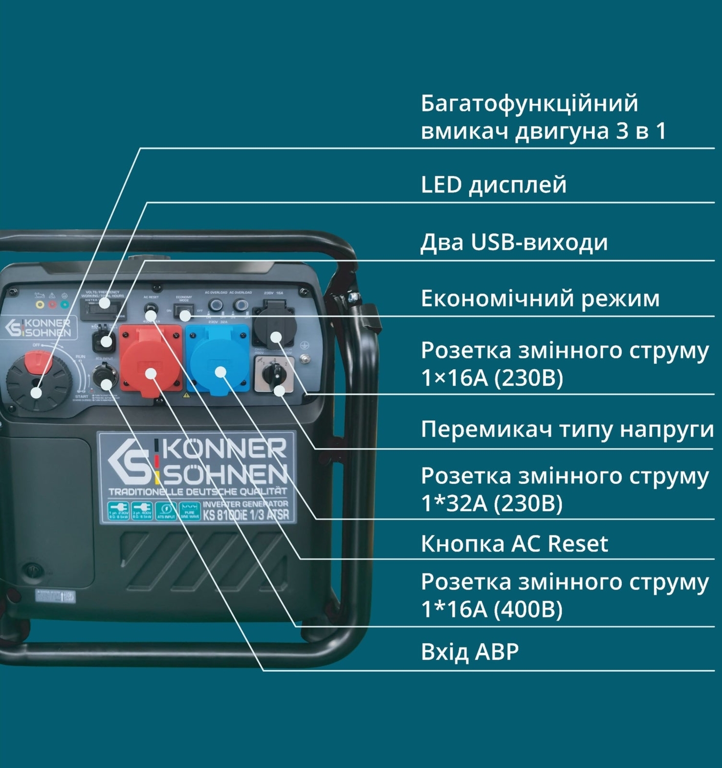 - Генератор інверторний бензиновий Konner&Sohnen KS 8100iE 1/3 ATSR 230/400В 8/8.5кВт АВР(ATS) (KS8100IE1/3ATSR)