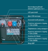 Містить багатофункційний LED-дисплей, індикатори стану, що сигналізують про робочий режим, спрацювання автомата захисту при перевантаженні або короткому замиканні, про низький рівень оливи, кнопку Reset, USB-виходи, автомобільну розетку 12 В і розетки 230 В.