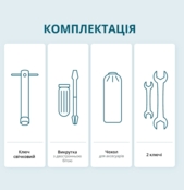 | Комплектація (можливі зміни в різних поставках) | Гайковий ключ – 2 шт., Генератор, Документація, Викрутка, Свічковий ключ, Чохол |