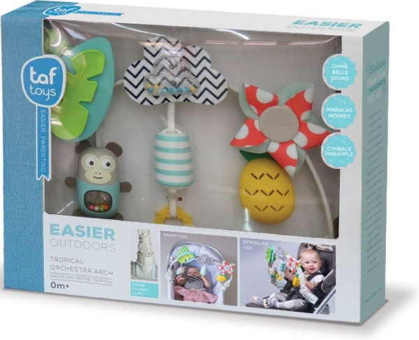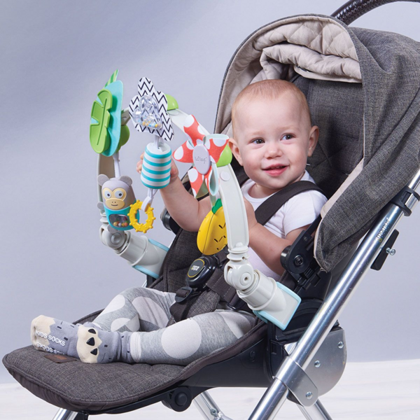 Гнучка дуга для коляски "Тропічний оркестр" - це три іграшки, які занурять малюка в гармонію тропіків, де бігають веселі мавпочки, світить сонечко і ростуть ананаси.