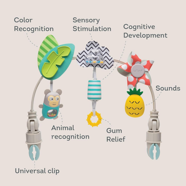 - Зручні кліпси легко і надійно кріпляться до більшості візочків, дитячих крісел і автокрісел.