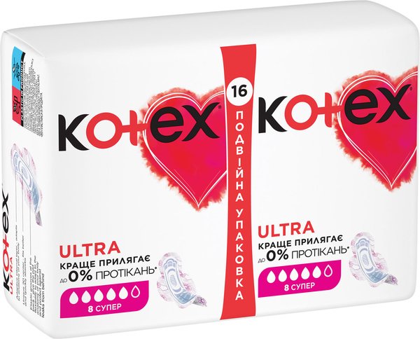 Нові прокладки Kotex Ultra Dry Super з верхнім шаром-сіточкою забезпечують максимальний захист і комфорт під час критичних днів. Завдяки інноваційній поверхні 2-в-1 з посиленим центром захисту Fast Absorb волога миттєво вбирається і поверхня залишається майже сухою. М'які, наче бавовна, краї та крильця тепер ще краще кріпляться до спідньої білизни, а подвійні бічні бар'єрчики допомагають запобігти протіканню з країв прокладок. Прокладки зберігаються в акуратній і зручній упаковці на мотузочках. Kotex Ultra Dry забезпечують до 100% захисту від протікань.