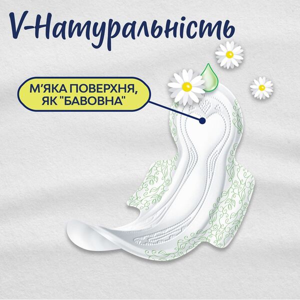 Прокладки з м'якою як "бавовна" поверхнею для чутливої шкіри збагачені натуральними екстрактами алое вера та ромашки. Анатомічна форма прокладки повторює контури тіла, забезпечуючи комфорт та захист від протікань. Без ароматизаторів. Виділення кожної жінки унікальні, тому на пакунку ми використовуємо V-індикатор виділень, щоб підібрати ідеальну прокладку. Більше червоного в індикаторі означає більшу міру поглинання. Пакування продукту виготовлене з матеріалів, що відновлюються, не менш ніж на 50%.