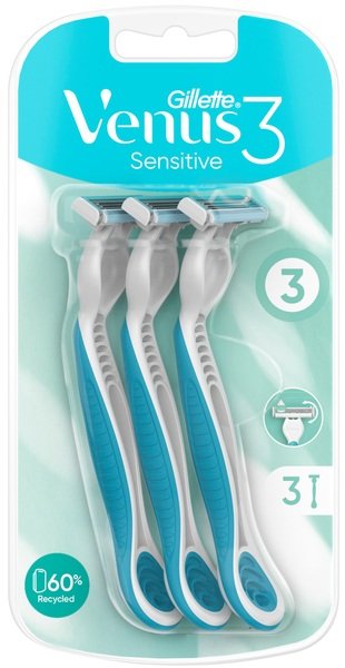 Одноразові бритви для жінок Gillette Venus 3 Sensitive – це гладке гоління за вигідною ціною. Вони оснащені плаваючою головкою з трьома лезами для гоління складних ділянок і смугою SkinElixir для легкого ковзання, яка захищає чутливу шкіру від подразнення після гоління. Насолоджуйтесь гладким та комфортнішим голінням (у порівнянні з Venus Simply 2).