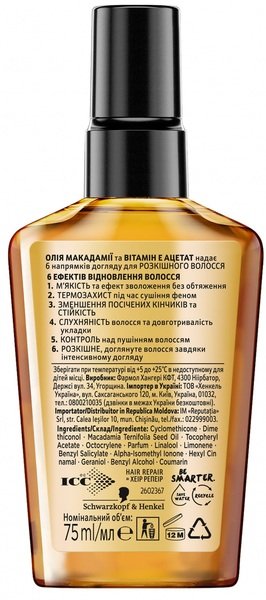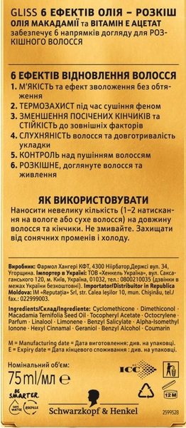 Олія GLISS для всіх типів волосся з олією Макадамії та Вітаміном Е Ацетат забезпечує 6 напрямків догляду для розкішного волосся: