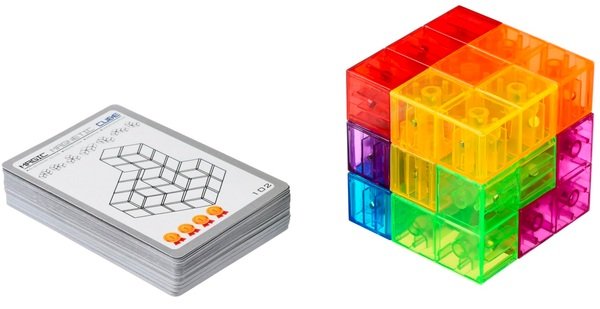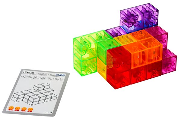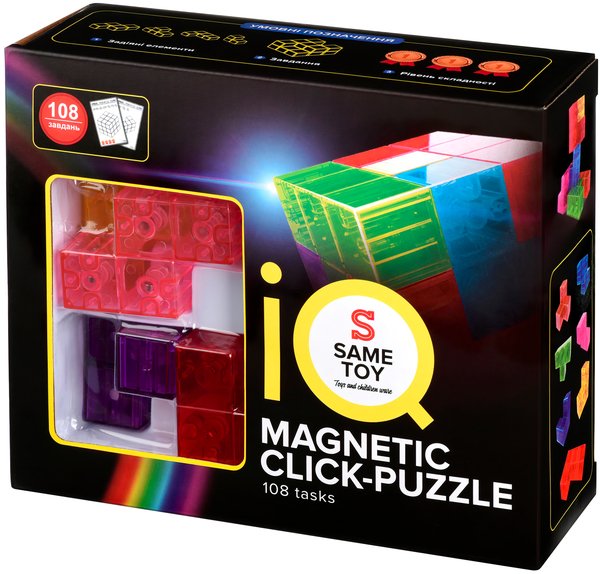 IQ магнітний клік-пазл у вигляді геометричного 3D-куба, який налічує сім блоків різної форми і кольору. У наборі є 54 двосторонні картки з 108 завданнями різного рівня складності. Необхідно розташувати деталі згідно з інструкцією на картці, щоб зібрати задану фігуру. Завдяки магнітів всередині блоків деталі легко з'єднуються між собою, утворюючи єдину конструкцію. Сім окремих частин магнітного клік-пазла можна скласти в великій кількості комбінацій.