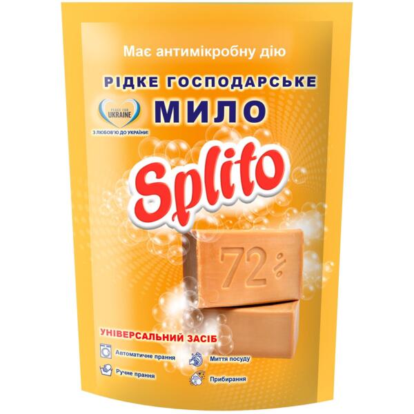 Рідке господарське мило Splito 72% — універсальний, м'який і безпечний засіб, який подбає про ефективне видалення різних забруднень. Продукт має приємну консистенцію і містить у своєму складі справжнє мило. Він призначений для прання та видалення забруднень з різних господарських поверхонь: сантехніки, посуду, кахлю та підлоги. Не рекомендується використовувати, якщо у вас чутлива або пошкоджена шкіра.