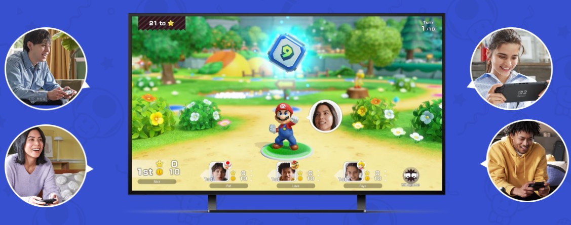Кидайте кубики, щоб змагатися з іншими гравцями на ігровому полі та зібрати якомога більше зірок. Кожне з 7 полів має свою індивідуальність! Нові правила для Jamboree TV включають командні матчі 2 на 2 та багато іншого. Крім того, якщо підключити сумісну камеру USB-C, ваше обличчя може з'явитися безпосередньо в грі.