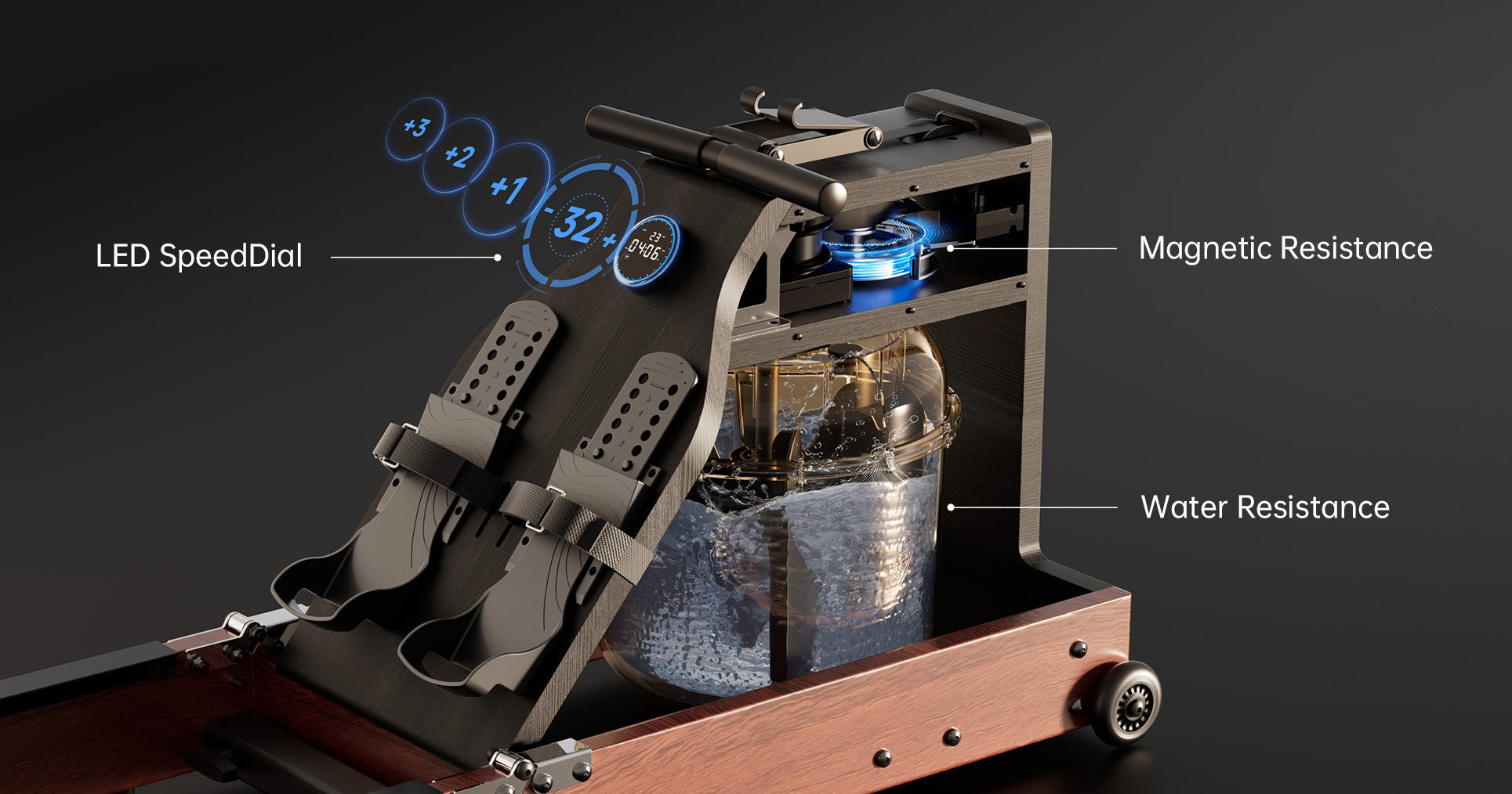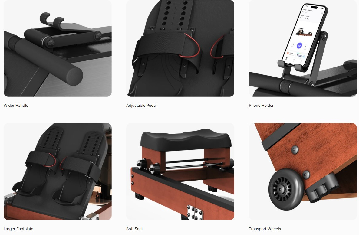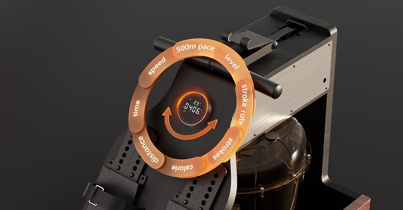 Подвійний водний і магнітний опір забезпечує плавну роботу і заспокійливий звук. Завдяки 32 регульованим рівням кожен може отримати індивідуальне тренування. Реалістичні відчуття від веслування і заспокійливий шум води створюють незабутній досвід.