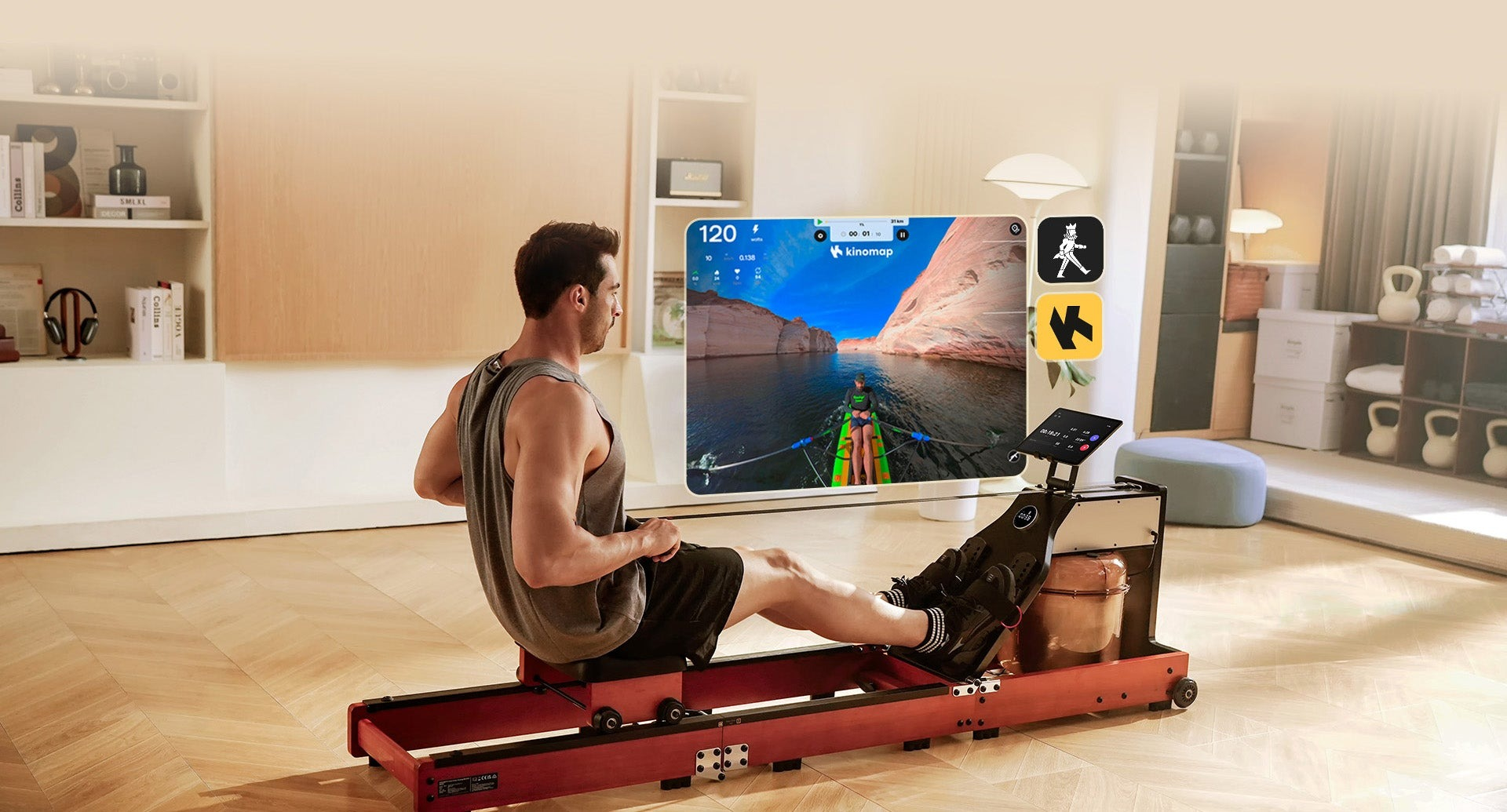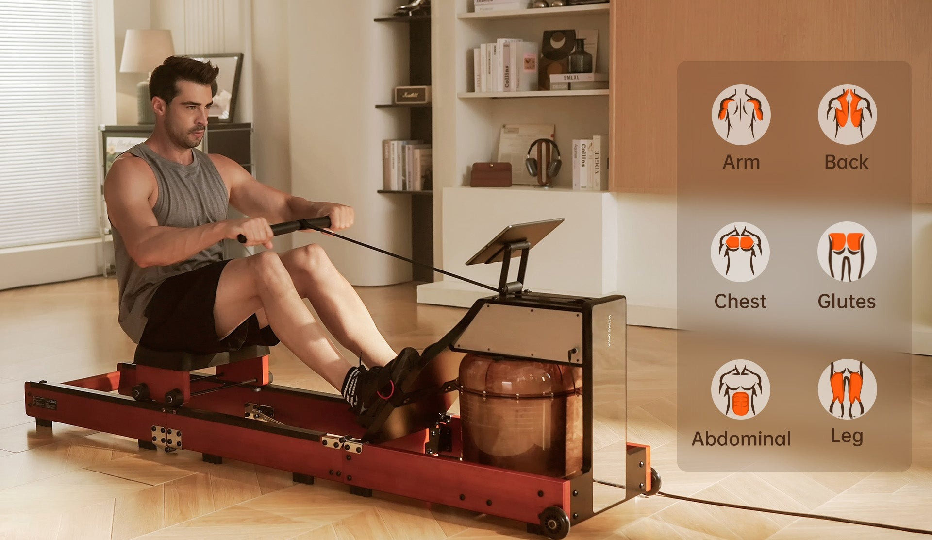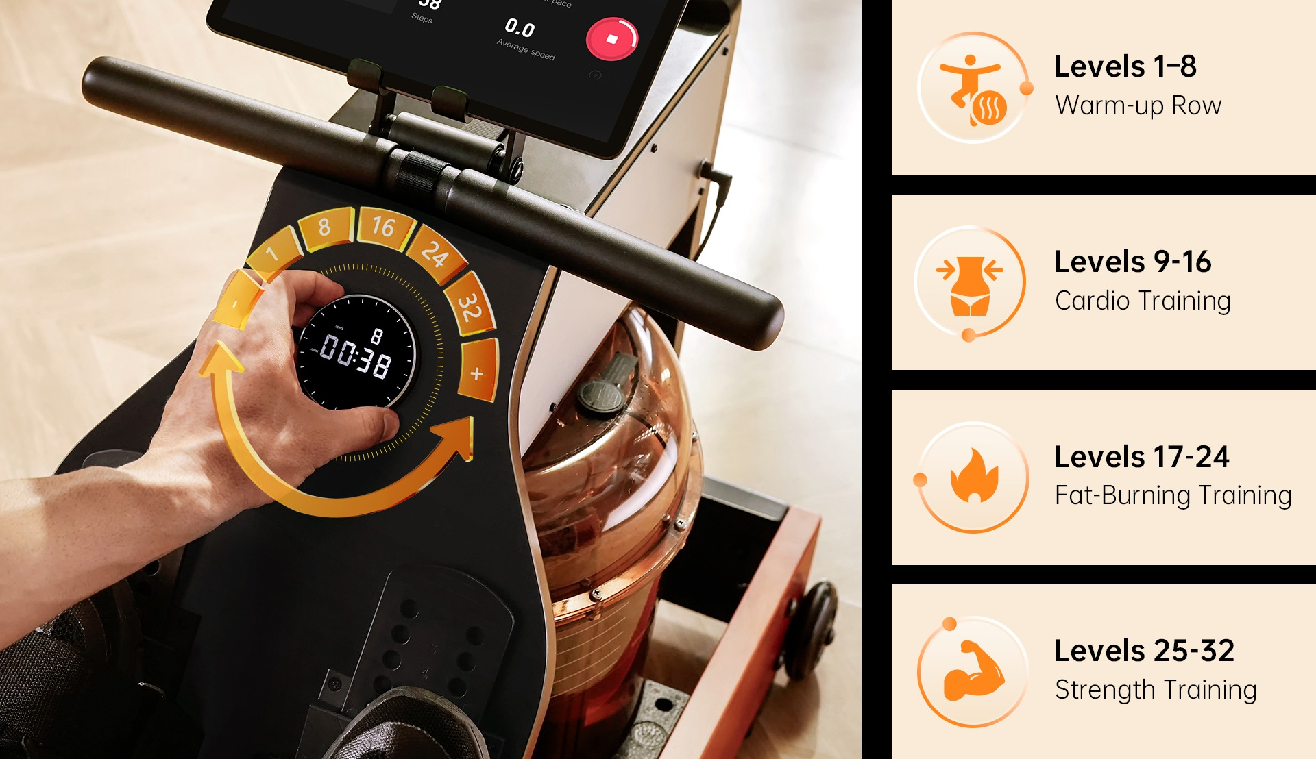 Подвійний водний і магнітний опір забезпечує плавну роботу і заспокійливий звук. Завдяки 32 регульованим рівням кожен може отримати індивідуальне тренування. Реалістичні відчуття від веслування і заспокійливий шум води створюють незабутній досвід.
