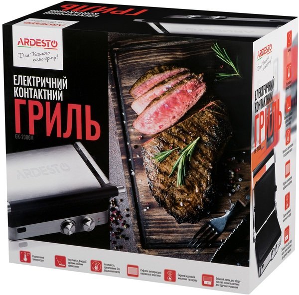 Гриль Ardesto дозволить Вам приготувати різноманітні і смачні страви, які порадують вас і ваших гостей. Гриль має кілька температурних режимів зі зручним регулюванням температури, а індикатор дозволить стежити за цим. Антипригарне покриття пластин забезпечить відсутність пригорання. Знімні пластини і піддон для збору соку – полегшать обслуговування і догляд за приладом.