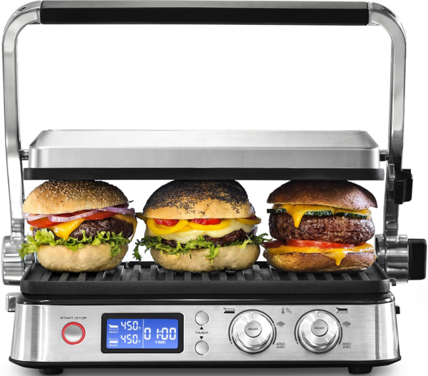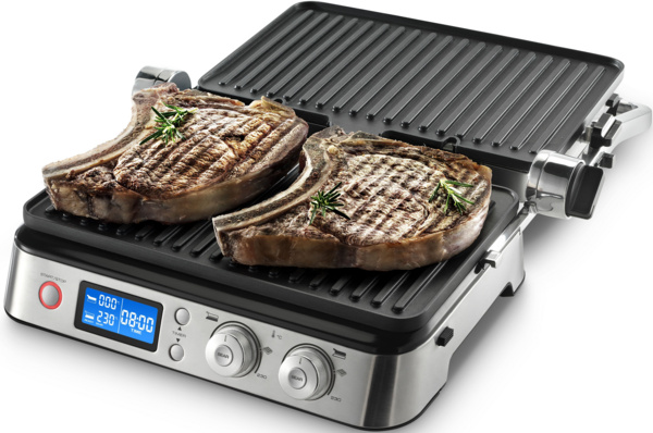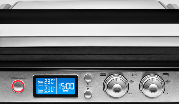 На панелі керування передбачено 2 окремі терморегулятори та кнопки, які дозволяють незалежно регулювати температуру на кожній пластині для абсолютної точності приготування. У комплектації гриля є 2 пласкі пластини, 2 пластини гриль і 2 пластини для вафель. Варто згадати, що пластини оснащені антипригарним покриттям, через що їх легко чистити.