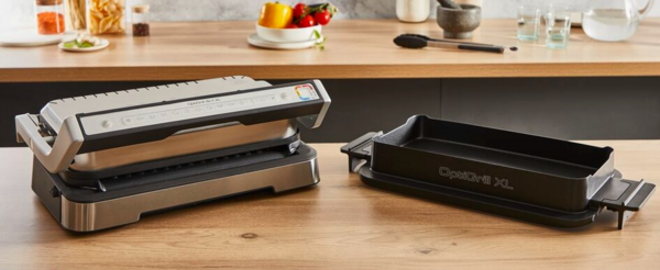 OptiGrill+ виробляє у 2 рази менше від диму, ніж традиційний домашній гриль, і обіцяє зручне приготування на грилі без диму в будь-який час!