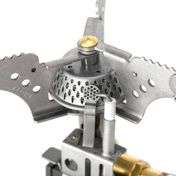 Газовий пальник Titanium Stove KB-0101 - компактний туристичний пальник із вбудованим п'єзопідпалом. Завдяки використанню надлегкого металу титану, цей пальник вигідно виділяється ваговою характеристикою на тлі подібних моделей лінійки пальників Kovea. Форма будови голови пальника гарантує рівне розсіяне полум'я під час роботи, тому теплові якості пальника будуть проявлені краще під час використання широкого посуду з дном більшого діаметра, ніж з вузькими чашками, наприклад.