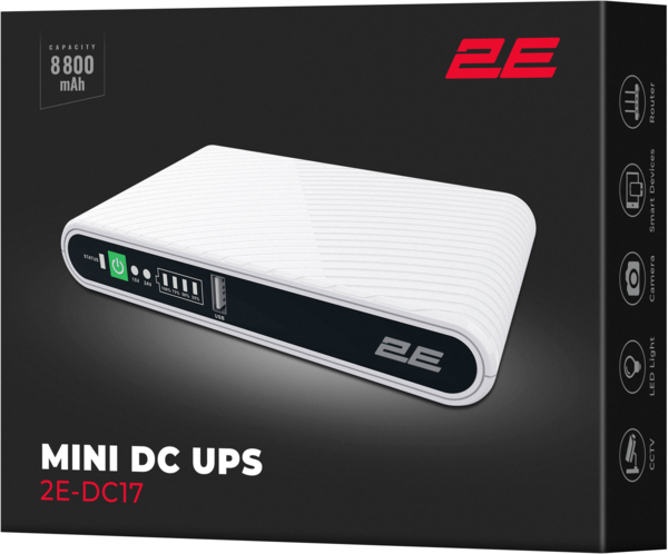2E Mini DC забезпечує безперебійне живлення, заряджання різноманітних пристроїв і підтримує технологію PoE. На відміну від традиційних ДБЖ із вихідною напругою 230 В змінного струму, модель має на виході напругу 5–12 В постійного струму, що робить її компактною, тихою і зручною. Завдяки літій-іонному акумулятору 8 800 мА⋅год гарантовано тривале резервне живлення. Можна використовувати для роутерів, систем відеоспостереження, хабів розумного будинку або охоронних сигналізацій, голосових помічників тощо. Наявність USB зумовлює можливість заряджати смартфони, планшети, цифрові камери та інші сумісні пристрої.