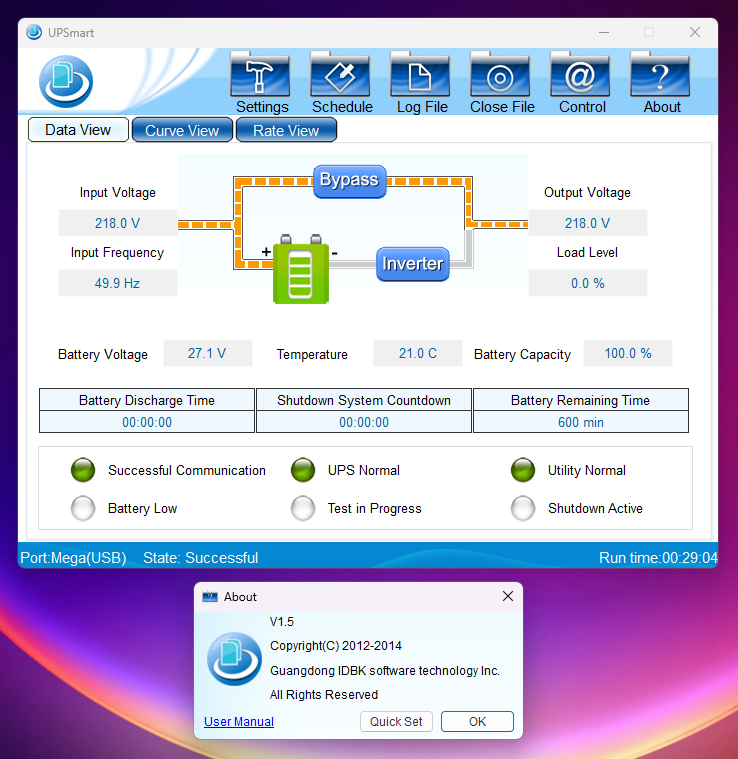 За ваги 11,6 кг пристрій має розмір 144 × 345 × 215 мм. Тип встановлення: TOWER. Рівень шуму – 50 дБ. Виріб має функції «холодний старт» та «рестарт», захист від короткого замикання, перевантаження, перегріву, повного розрядження акумулятора. Самотестування, автоматичний заряд АКБ, якщо ДБЖ приєднано до мережі, ECO режим економії електроенергії.