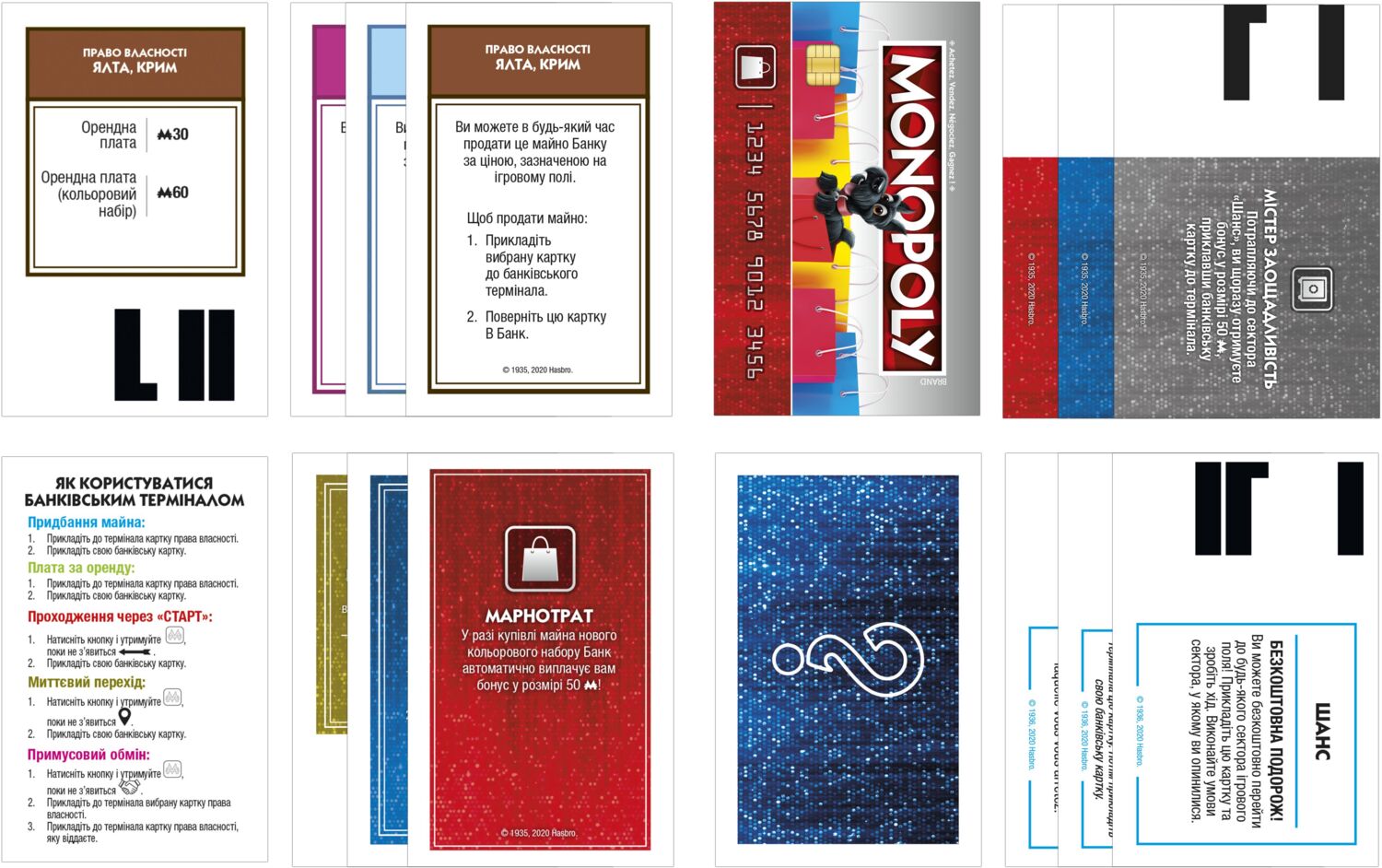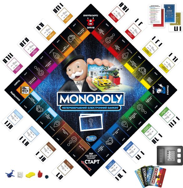 | Комплектація | Ігрове поле, Банківські картки – 4 шт., Банківський термінал, Жетони – 4 шт., Гральний кубик, Інструкція, Картки "Шанс" – 4 шт., Картки права власності 16 – шт., Довідкові картки – 4 шт., Фігурки – 6 шт. |
