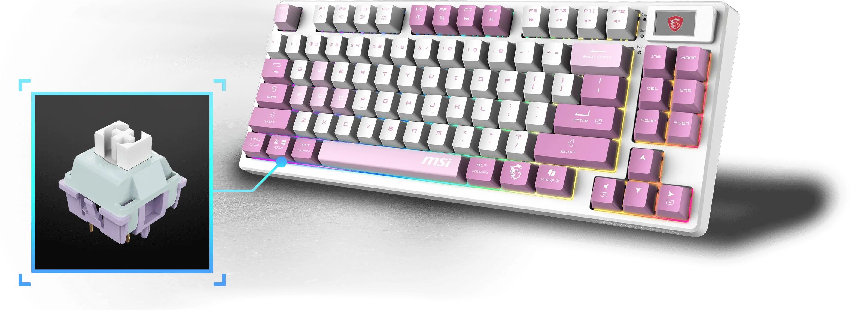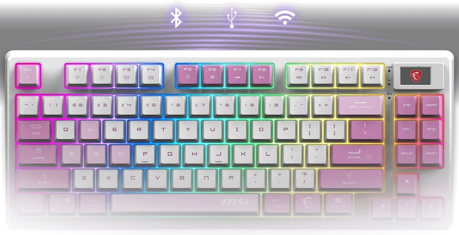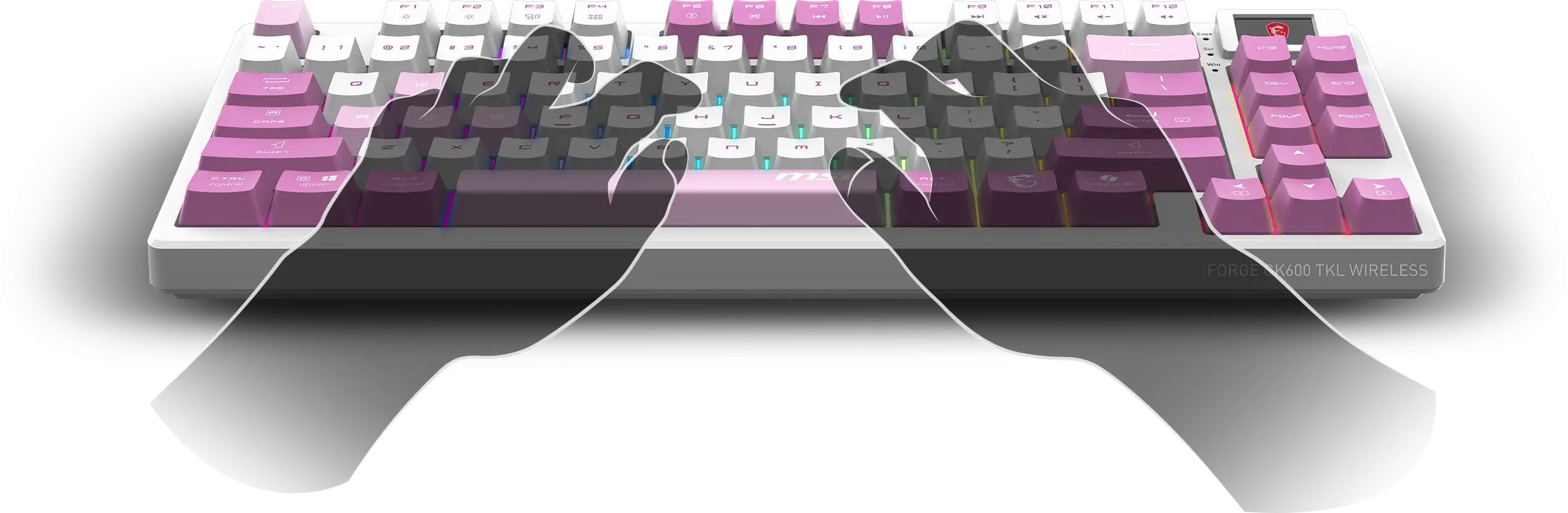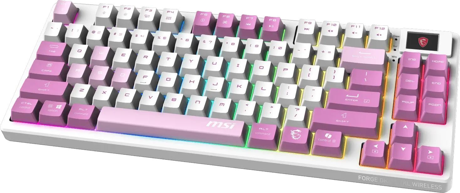MSI FORGE GK600 TKL WIRELESS - універсальна клавіатура без цифрового блока з режимами підключення 2.4 ГГц, Bluetooth і USB. Вона оснащена змінними лінійними механічними перемикачами, міцними PBT кейкапами, звукопоглинаючими прокладками та дисплеєм 1.06". З RGB-підсвічуванням і батареєю 4000 мА*год, вона ідеальна для геймерів і творців.