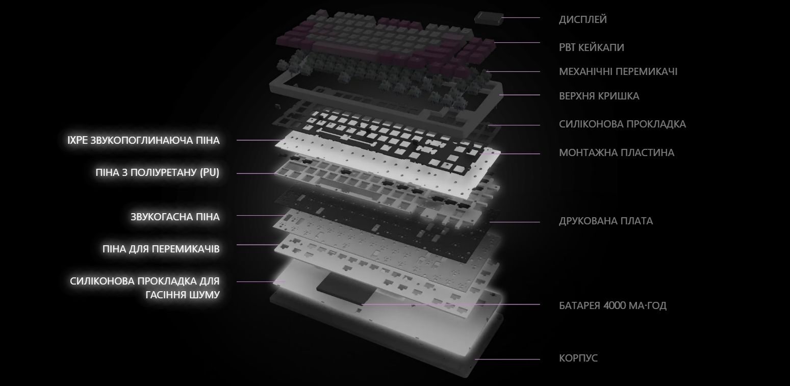 Декілька шарів звукопоглинаючої піни та прокладок знижують небажані шуми і зберігають приємне звучання кожного перемикача. Це забезпечує збалансовані акустичні відчуття без зайвих відволікань.
