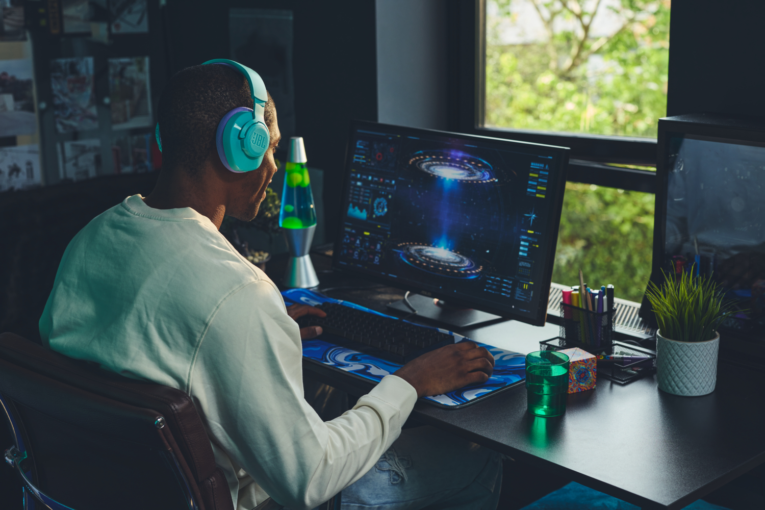 Контролюйте те, що ви чуєте, покращуйте свою гру. Використовуйте програмне забезпечення для ПК, щоб налаштувати JBL QuantumSURROUND, еквалайзер, побічні тони, налаштування мікрофона та багато іншого для максимального занурення у звучання. Завантажте програму для навушників JBL безкоштовно, щоб налаштувати еквалайзер, мікрофон і параметри об'ємного звуку для ідеального ігрового середовища.