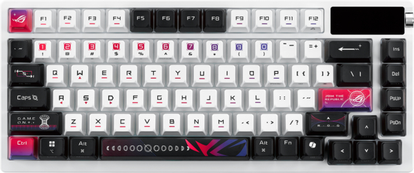 Стильна й функціональна, клавіатура ROG Azoth X оснащена напівпрозорими ковпачками, які пропускають RGB-підсвічування з трьох сторін, створюючи привабливий візуальний ефект. На передню й верхню сторони кожного ковпачка методом сублімованого друку нанесено малюнок у "зоряному" стилі ROG Stellar, що надає клавіатурі унікального вигляду та гарантує, що оформлення клавіатури залишатиметься чітким і яскравим навіть після незліченних ігрових сеансів.
