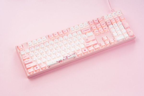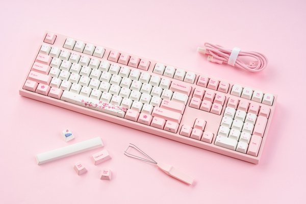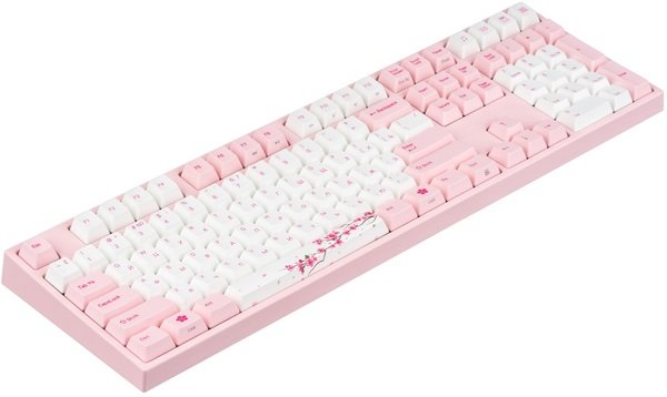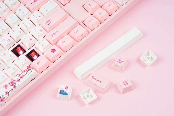 Varmilo MA108M Sakura – для геймерів, які люблять нестандартні дизайни. Поєднання ніжно-рожевого з білим, ефектний принт, «м'яка» підсвічування – всі ці особливості роблять модель чарівною.