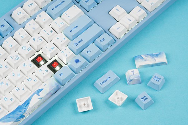 Ковпачки виготовляються з міцного пластику PBT, що гарантує надійність і довговічність. Для гравіювання символів на боках застосовують технологію комп'ютерного друку dye-sublimation. Друкувати на клавіатурі можлива завдяки текстурірованнонго верху клавіш.