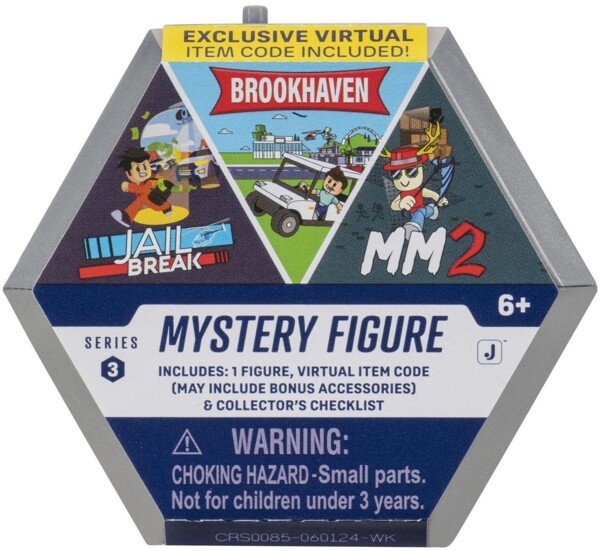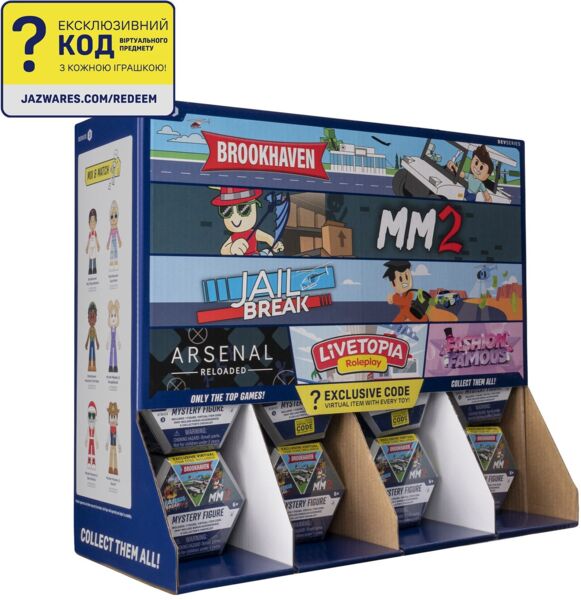 Упаковка повністю закрита, вміст прихований. Кожна коробочка містить одну з 12 видів, 7 сантиметрову фігурку сюрприз, найвідоміших ігрових персонажів з топових Roblox ігор: Arsenal Reloaded, Brookhaven, Jailbreak, Murder Mystery 2, Livetopia та Fashion Famous.