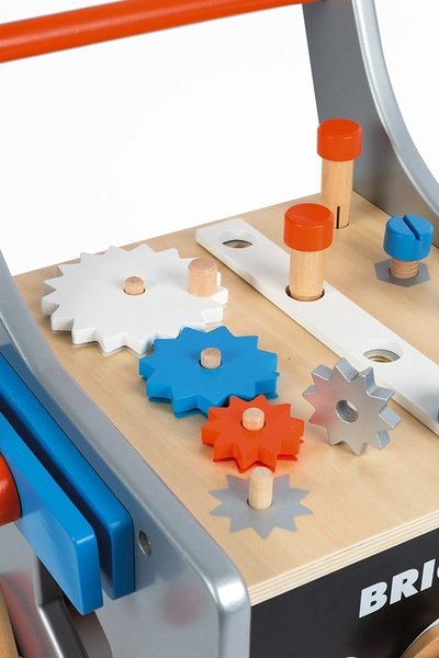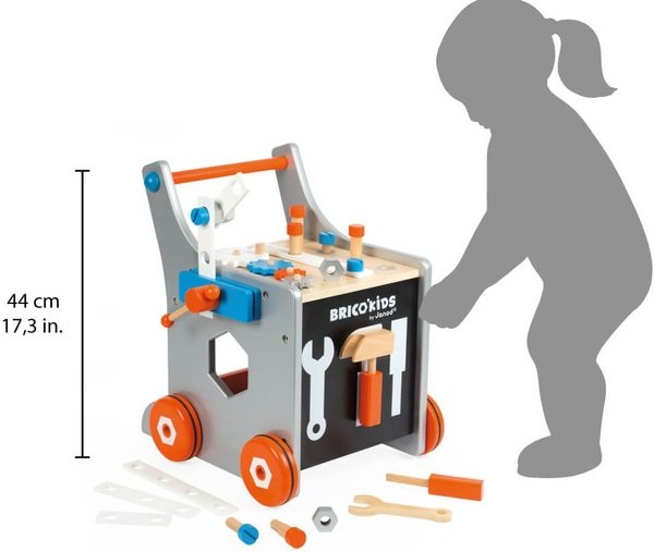 Дерев'яна візок з 3-ма магнітними інструментами (молоток, викрутка і гайковий ключ), 1 гвинт, 4 поворотні механізми, 18 аксесуарів. Металева вісь для фіксації коліс. Безшумні колеса, покриті гумою. Рольові ігри дуже корисні для всіх дітей без винятку. Вони допомагають в соціальному розвитку, вчать дітей самостійності і відповідати за свої вчинки.