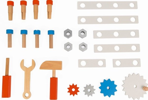 Здравствуйте, Карина! В комплекте набора Janod "Мастерская на колёсах": тележка, молоток, гаечный ключ, отвертка, деревянные винты, гайки, пластины, шестеренки.
