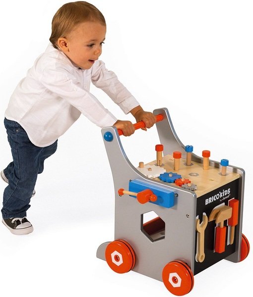 Несмотря на то, что этот набор ну, очень мужской и увидели мы его в гостях у моего племянника, который с огромным удовольствием возил эту тачку по всей квартире, дочь очень просила и ей такой же купить. Подсказали, что брали в МОЙО, там действительно большой выбор игрушек хороших, и в частности Janod, купила и нам такой набор. Ребенок с огромным интересом играет в такой конструктор. Он даже чем-то поучительный - уже сейчас дает понимание работы механизмов, шестеренок, и винтов. Всё деревянное, с таким покрытием, что никаких заусенцев и заноз быть не может. Размер очень большой у всех подвижных элементов, держать их в руках удобно. Ребенок без проблем справляется, много разных возможностей для игр. Колёса у тачки с резиновыми вставками, от чего очень тихо ездит.