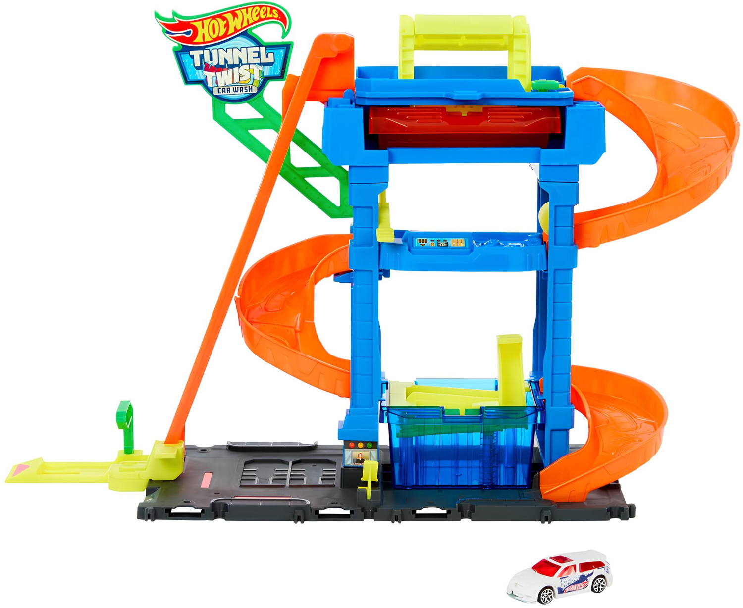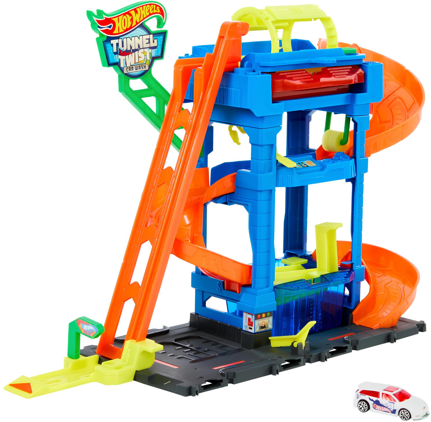 Вирушайте в захопливу пригоду разом з ігровим набором "Автомийка: Шалені віражі" із серії Hot Wheels City. Маленькі автолюбителі направляють свою машинку Hot Wheels до входу автомийки. Завдяки зручному механізму вона плавно підіймається на гору. Машинка проходить через тунель з гарячою водою, де вона змінює колір вперше, а потім стрімко спускається, де на неї чекає резервуар із крижаною холодною водою (не більше 10ºС), щоб змінити колір знову.