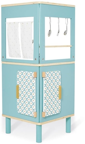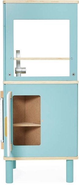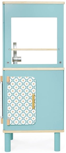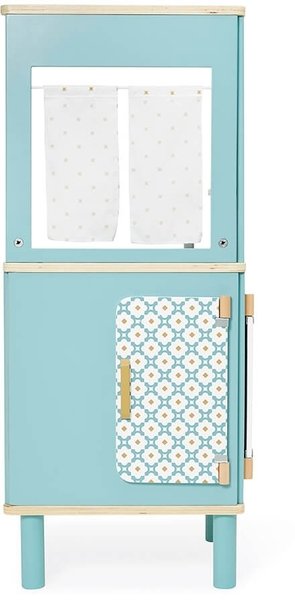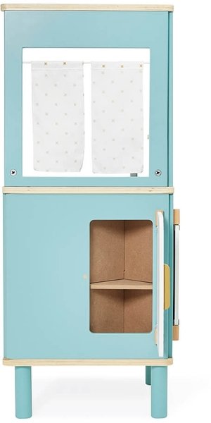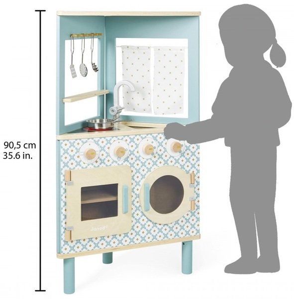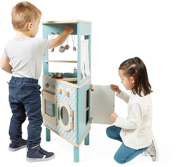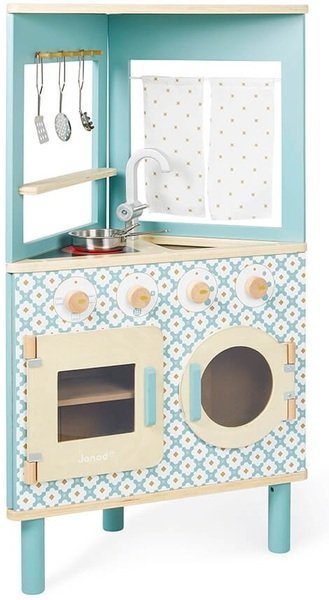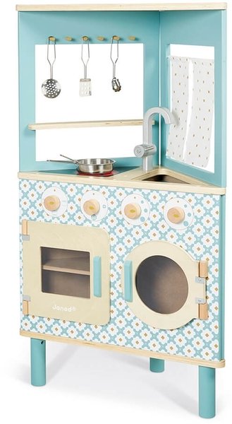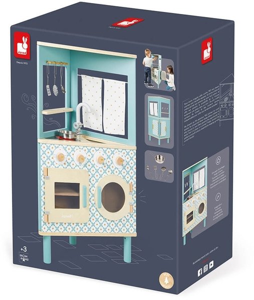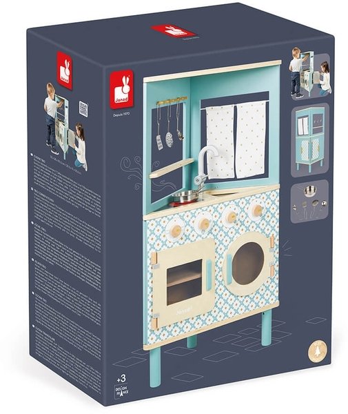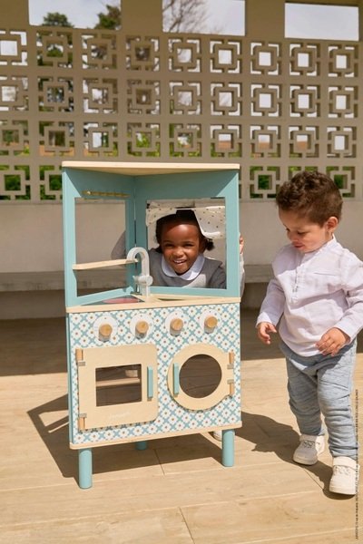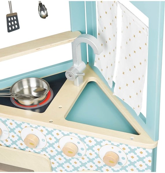 Вона дає змогу уявити себе маленьким кухарем і скористатися ігровим простором не з одного боку, а з трьох! Унікальна трикутна форма робить цю кухню для дітей від 3 років спритною іграшкою-імітацією, що забезпечує комплексний і захопливий ігровий досвід! На основній стороні є все необхідне для приготування смачної їжі для сім'ї та друзів: варильна панель, раковина з краном, духовка та її механічні ручки, що повертаються, щоб вибрати потрібну температуру. Є також пральна машина з дверцятами-ілюмінатором, щоб завжди мати чисті чайні рушники і насолоджуватися абсолютно реалістичною грою! А коли ви готуєте, що може бути кращим, ніж гарний краєвид із вікна? З цією дерев'яною плитою Trio це можливо! 2 великі отвори, схожі на вікна, дадуть вам змогу спілкуватися з друзями під час гри! Один з отворів красиво оформлено легкими фіранками. З інших боків є шафи для зберігання, чому б і ні, 5 металевих кухонних приналежностей, що входять до комплекту. Нам подобається ретро-стиль цієї дитячої кухні, виконаної в красивому блакитному кольорі та з вінтажними візерунками білого й охристого кольору! Натуральний тон дерева також присутній для пом'якшення загальної картини. Практично, коли час гри закінчився, кухню можна прибрати в кут, щоб вона займала якомога менше місця в нашому домі! Нашим маленьким кухарям сподобається бути схожими на дорослих, грати в чаювання і придумувати оригінальні страви на цій прекрасній кухні Trio!