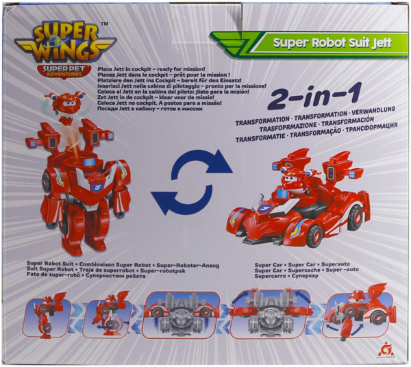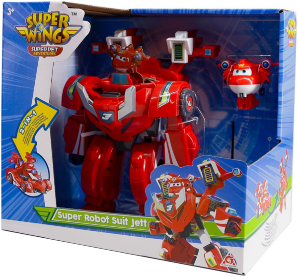 Ласкаво просимо до нового захопливого сезону світового хіта Super Wings - продовження 3D-анімованого серіалу, що розповідає про пригоди літачка Джетта та його нових друзів. У команді Супер крил з’явилися нові друзі – супер улюбленці котрі, підсилюють здібності Super Wings і виводять їх на новий рівень. Супер улюбленці мають нову захопливу здатність. Приєднавшись до Super Wings, вони зможуть покращити їх, надавши Джетту та його друзям Super Wing неймовірне нове спорядження та можливості. Super Wings - це завжди супер пригоди. Супер Крила Джетт і його суперробот костюм відправляються у велику світову подорож. Міні Джетт можна поставити до кабіни супер робота кількома простими кроками, і він готовий до найскладнішої роботи. Робо-костюм можна перетворити на супертранспортний засіб за 4 кроки, щоб доставити Джетта як найшвидше до місця де потрібна допомога. Джетт може зайняти місце в кабіні та буде готовий до надскладних завдань у костюмі суперробота або місце в авто, щоб як найшвидше примчати на допомогу суперкаром. Джетт у суперкостюмі заввишки близько 18 см та виготовлений з міцного пластику. Підходить для дітей старше 3 років. (Акумулятори не потрібні).