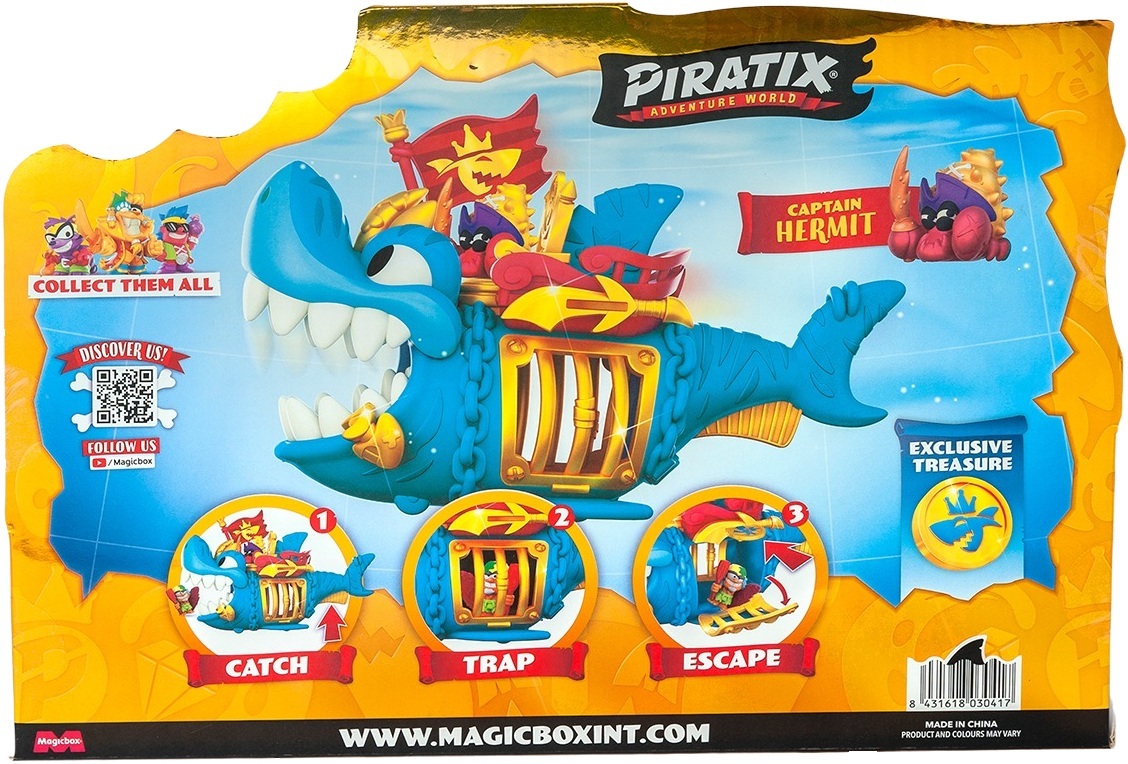Яскраві персонажі, ексклюзивні монети та атмосфера справжніх скарбів перетворюють гру в емоційну подорож, де ви стаєте головним героєм. Шукайте, колекціонуйте, обмінюйтеся з друзями та влаштовуйте змагання. Зустрічайте одну з найвеличніших володарок морів та океанів - королівську акулу. Капітан Піратікс приручив цю нестримну бестію та тепер володарює безмежними водами світового океану. Проте в нього є суперниця - це чорна королівська акула. Збирайте всіх та обирайте - або ж вони разом підкорюватимуть океани, або ж будуть затятими суперниками. Деталізація акули робить гру ще більш захопливою.