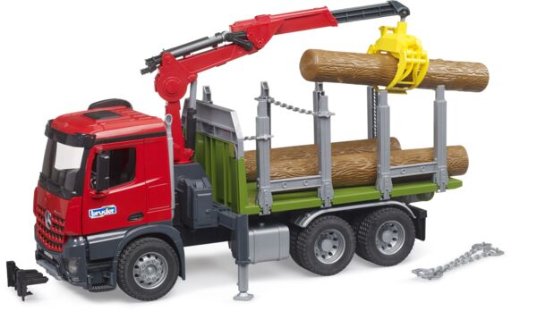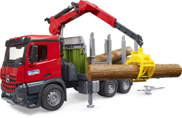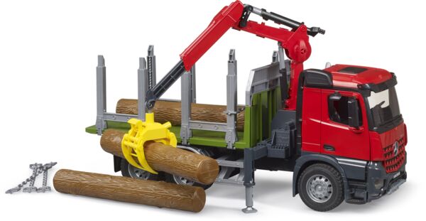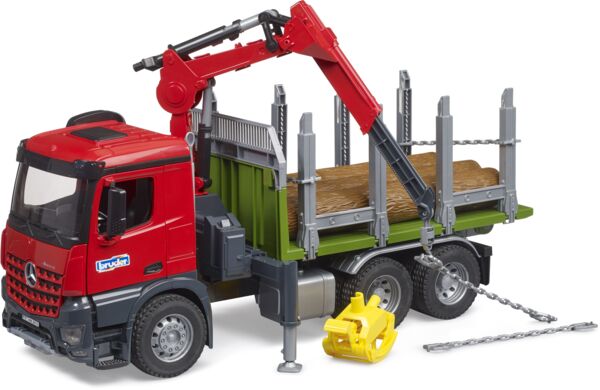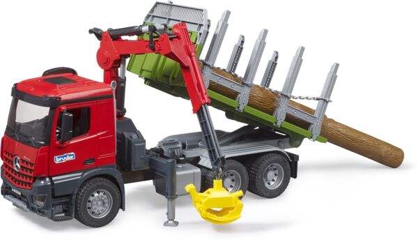 Потужність, довговічність і ефективність часто є вирішальними елементами робочого дня на дорогах і будівельних майданчиках. Ось чому новий Mercedes-Benz Arocs був спеціально розроблений для цих потреб. Дизайн також був переглянутий, щоб відповідати технічним характеристикам. Наприклад, передня частина решітки радіатора виконана в типовому для Arocs стилі, що відображає його потужність. У цій моделі приділили особливу увагу довговічності, яка характеризує продукцію BRUDER, і обладнали кабіну дверцятами, що відчиняються, щоб дати іграшковим фігуркам доступ до транспортного засобу. Вантажний кран оснащений грейфером для переміщення колод. Захват можна зафіксувати у відкритому положенні. Серед інших особливостей - опори крана, що висуваються та опускаються, а також ланцюги на стійках вантажної платформи для кріплення вантажу. Звичайно, стійки також можуть бути відкинуті для завантаження лісоматеріалів збоку.