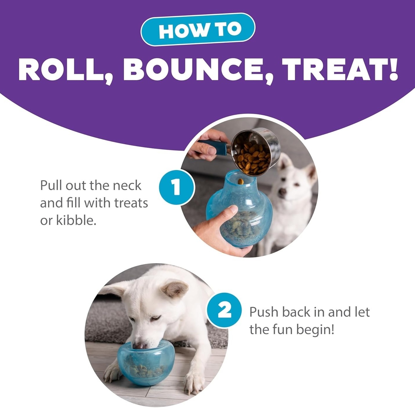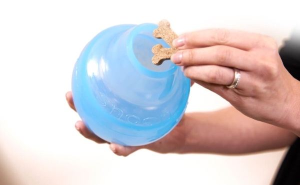 Відтягніть шийку та заповніть середину ласощами, або гранулами. Після заповнення іграшки ласощами можна помістити в центр невеликий м’ячик, щоб ускладнити гру. Іграшку також можна використати, як миску для неквапливого годування.